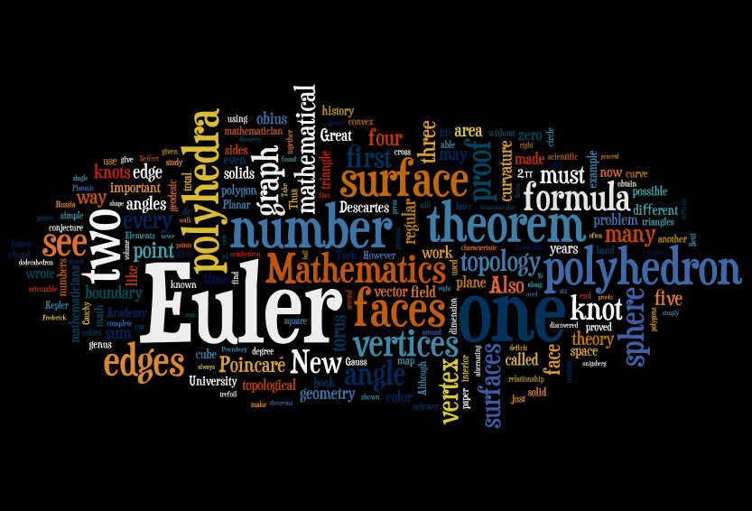 It turns out that Wordle can create word clouds quickly, even from large files. For example, I created a word cloud from all of the text in my book, Euler’s Gem (over 300 pages). The word cloud is below. (Who needs Cliff’s Notes?)