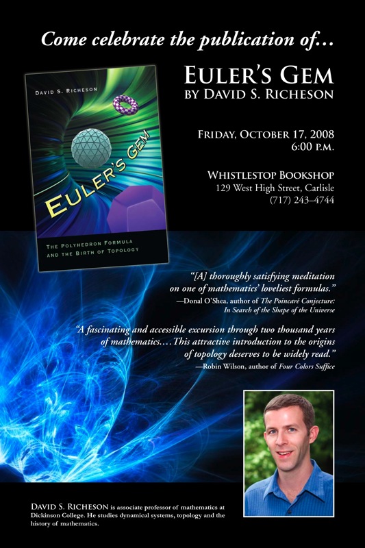 If you happen to be in or near Carlisle, PA tomorrow (Friday, October 17, 2008, 6:00-7:30), come by the Whistlestop Bookshop. I’ll be signing copies of my new book Euler’s Gem.