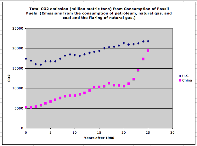 His idea is very slick. At the beginning of the semester he gives his students data in Excel spreadsheets. In a lab they find mathematical models to fit the data—mostly linear, quadratic, cubic, and exponential functions. Even this process is enlightening. It is wild to check out some of this data. For example, look at how China’s CO2 emission changes at the turn of the 21st century:
