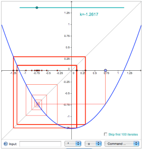 This is my third and final post on this topic. I created a Geogebra applet that generates cobweb plots for various families of discrete dynamical systems. [Note: for some reason, I can’t get the Javascript to work on Safari on my Mac, but it works with Firefox. If anyone can help me solve the problem I’d be very grateful.]