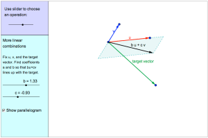 The first applet showcases all the basic vector operations: addition, scalar multiplication, subtraction, linear combinations, the dot product, vector projections, and the cross product. I’ve used this applet in class to show the students how the operations work. I’ve also given them the link so they can play with it on their own (they can even play with it in class, since we are in a computer-equipped classroom).