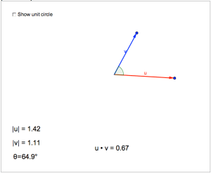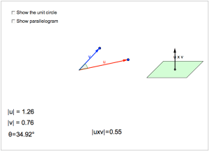 The other two applets are intended for the student use. The intent is for the students to discover properties of the dot product and the cross product on their own. All I told them was that the dot and cross products were two attempts to define vector-vector multiplication. Then I sent the to the computers to play with the applets. I didn’t define anything ahead of time. There are questions below the applets that guide them through the discovery process. Then we came back together to discuss their findings. I was very pleased with how it worked. For example, one group of students figured out that .