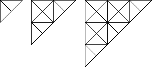 Counting the type 2 triangles is tricker. Let denote the number of segments in the hypotenuse of the triangle. Examples of