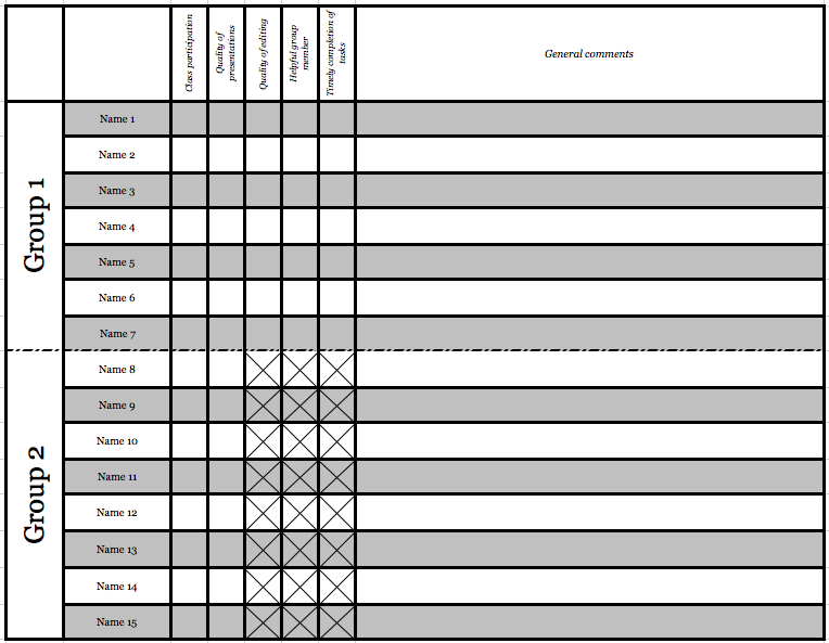 Peer evaluations. I have the students evaluate each other (and themselves) at the end of the semester. I use this information to help me assign their class participation grades. I’ve found that sometimes students who are quiet in class will get rave reviews from their classmates (“she was always extremely helpful with editing,” “he was very good at explaining the concepts to me,” etc.). On the flip side, some of the more “active” members of class could be bad collaborators (“he never showed up for our editing sessions,” “her secretarial work was never done on time,” etc.). Here is an example of the evaluation sheet. (Excel file)