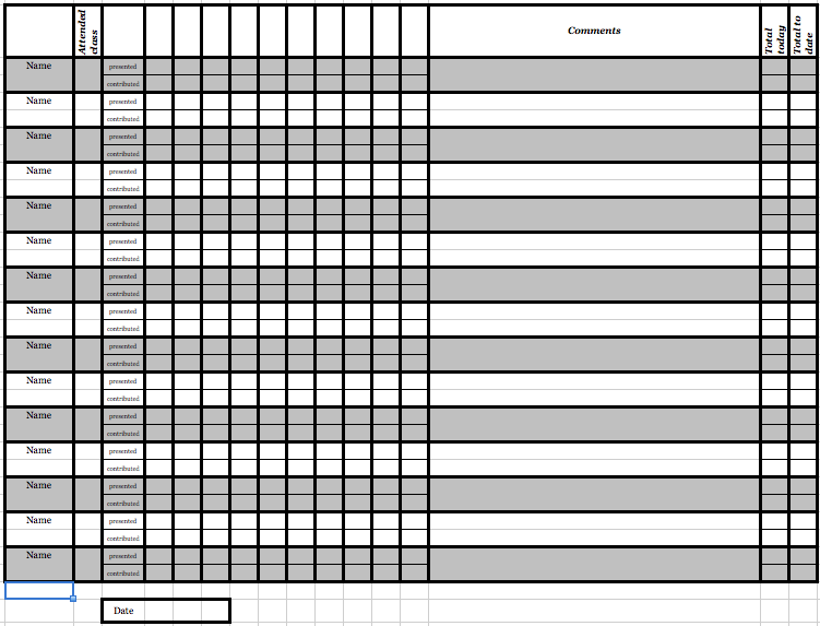 Daily sheets. The students are required to participate in class. Each day I bring the sheet below and keep track of who presents and who makes comments. I also leave myself notes, like “great proof!” or “volunteered to present the theorem when Billy was sick” or “came to class 15 minutes late.” (I number each column by the theorem/problem number.) I use these sheets to help assign a class participation grade at the end of the semester. (Excel file)